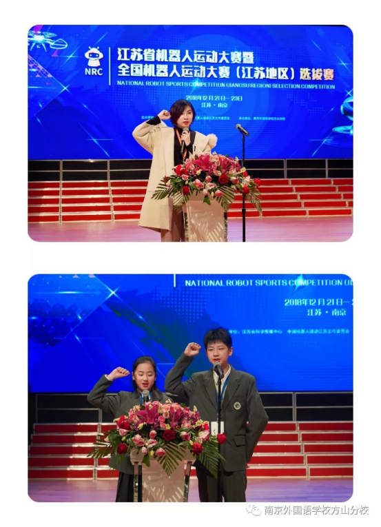 之后,裁判员代表杨璐老师代表裁判队伍,我校两位参赛选手粱灿同学和张一涵同学代表全体参赛者先后进行了宣誓,表达了他们对维护比赛公平公正与友好参加比赛,遵守比赛规则的决心。