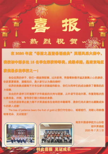 在这美好的时节,南京外国语学校方山分校初中学段的老师们和同学们收到了来自英语风采大赛组委会的喜讯:我校初中学段共有42名学生获奖,值得一提的是,七年级有8名同学在比赛中获得特等奖,八年级有7名同学获得特等奖。
