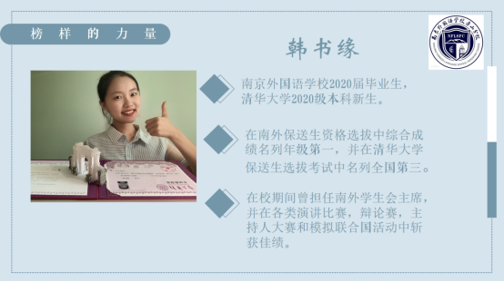 南京外国语学校2020届优秀毕业生韩书缘同学结合自身,从心态调整、习惯培养、总结反思等角度介绍了自己的学习经验和方法。同时,她还与同学们分享了自己丰富多彩的课余生活,希望同学们能找到自己的兴趣点并为之努力。最后,韩书缘还分享了自己如何与父母相处的心得体会。