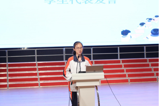 南京外国语学校方山分校梅欣晔同学作为学生代表进行了发言,她表示将以满腔的热情投入到新学期的学习中去,在学习前进的道路上策马扬鞭,取得更大的进步。