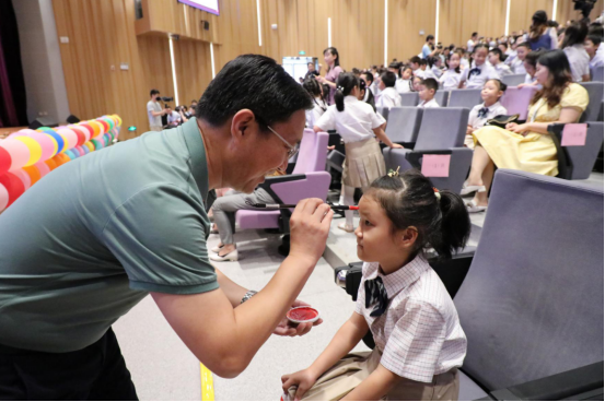 朱砂启智是古代开蒙礼的重要仪式,点朱砂又称之为“开天眼”,即在新生的额头正中点上红痣,“痣”通“智慧的智”,寓意着开启智慧,以此寄托美好的愿望:从此眼明心明,好读书、读好书。额头上那一点鲜红,饱含着父母、老师、学校的美好祝愿。