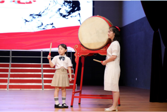 在古代,读书人去考取功名时,往往通过击鼓的方式表达他们读书上进和考取功名的愿望。鼓声鸣响,深有寓意。鸣响的“鸣”和明白的“明”同音,师长击鼓,鸣响三声,表示学童从今启蒙,告别蒙昧。学童击鼓,鼓声鸣响,表明志向,鼓声越响,声音越大,志向越大。一年级年级组长滕爱玲老师和学生代表共同上台击鼓,以示学生从今启蒙。