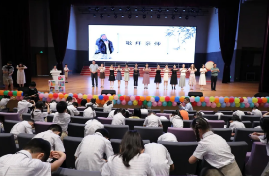 “古今学者必有师,师者,所以传道、授业、解惑也。”仪式第二项是古人在入学时最隆重的拜师礼。校领导及一年级班主任代表全体老师上台接受学生行拜师礼。孩子们整齐洪亮的声音回响在千人剧场:拜,感谢老师,南外方山人生路开启;再拜,感谢老师,言传身教培育恩;三拜,感谢老师,厚德博学铭记心。