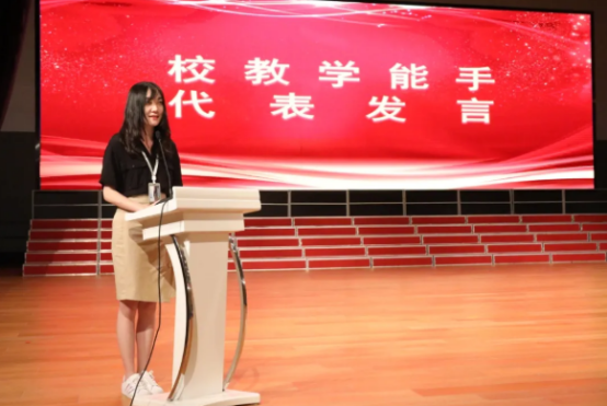 陈琪老师作为校教学能手代表发言,她分享了自己在教育教学工作中的成长经验和感悟。她说:“我愿做一块基石,用踏实和稳健,为孩子的成长铺垫开阔的道路;我愿做一把火炬,用光和热,把爱和感动带给更多的孩子们,真正实践生命不息,奋斗不止。”