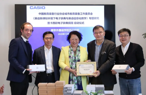 11月9日,《英语新课标环境下电子辞典与英语信息化教学》专题研究暨卡西欧电子辞典捐赠启动仪式在南京外国语学校方山分校举行。中国教育装备行业协会城市教育装备工作委员会乔玉全理事长,江苏省教学研究室何锋书记,卡西欧(中国)贸易有限公司电子教育营业统辖部李渝清部长、唐金良课长、孔伟炎主任以及南京外国语学校方山分校朱善萍校长、Martin副校长和部分初中、高中学段的英语教师们参加了此次活动。